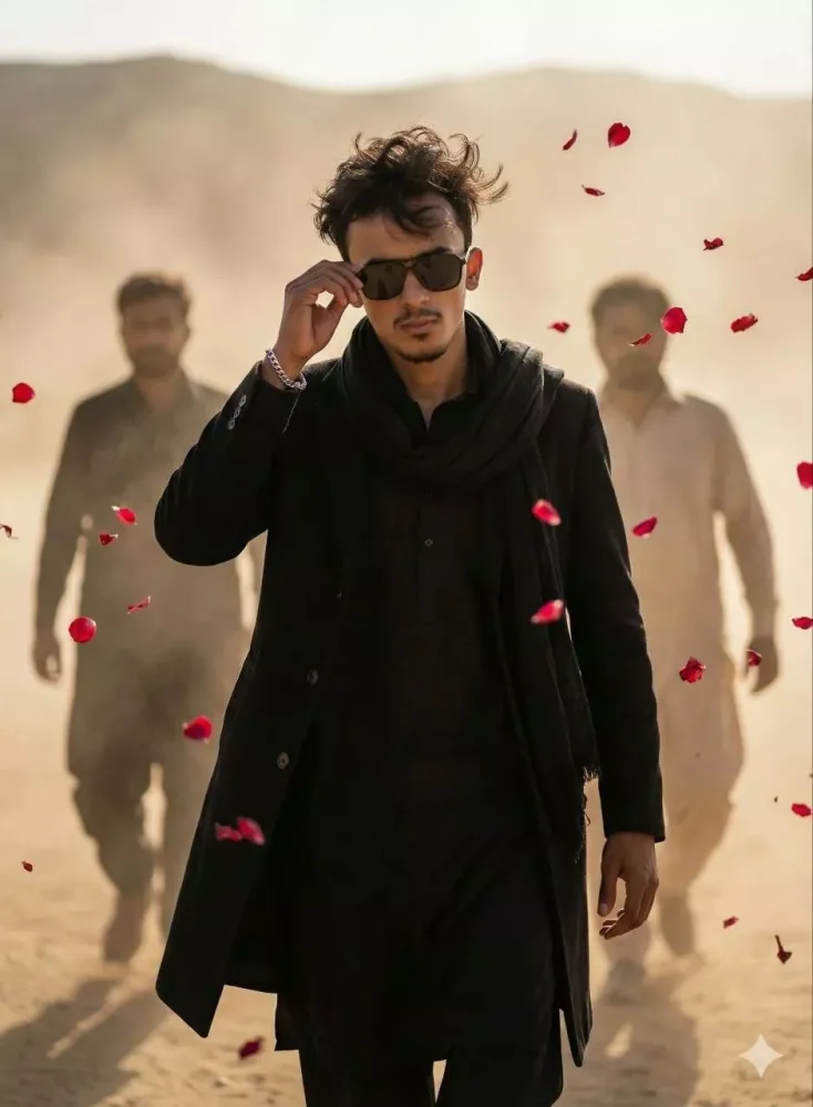 A confident reference image person walking in slow motion through a desert landscape, medium close-up front shot. He is wearing an all-black outfit — black kurta, long black coat, and a black scarf. His hair is slightly messy in the wind, adjusting dark sunglasses with one hand in a calm, attitude-filled pose. A silver bracelet on his wrist. Two men walking behind him through dust and haze, softly out of focus. Red rose petals flying in the air. Light dust storm, warm sunlight, soft cinematic shadows. don’t change face at any chance