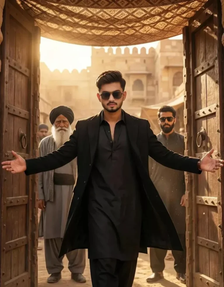Ultra-realistic, cinematic full body portrait of the same young man from the reference photo(exact same hairstyle from the uploaded image, sharp eyebrows, perfectly trimmed beard, intense yet calm confident expression, face clearly toward the camera).A powerful cinematic moment shows a stylish villain standing at a massive ancient wooden door just as it opens wide The door panels are fully opening outward, and the man stands in the center with both arms spread wide, palms slightly open, symbolizing dominance and control-as if welcoming chaos He wears a black kurta, long black overcoat, and dark sunglasses. His coat falls perfectly, creating a clean, commanding silhouette. His posture is straight, chest open, feet firmly planted Warm golden sunlight floods in through the open door behind him, creating intense backlight, glowing dust particles, and dramatic rim light around his shoulders and hair. Patterned fabric shades hang overhead, casting cinematic shadows on his face and outfit. Behind him, two men stand in controlled formation:An elderly man with a long white beard, black turban, layered grey robe, heavy traditional jewelry, calm and powerful.A younger bearded man wearing dark sunglasses and dark traditional clothing, slightly blurred for depthThe location is an ancient desert marketplace/sandstone fort, with textured sandstone walls, arches, and warm golden tones.Camera angle slightly low, centered composition, capturing a slow-motion grand entrance.Highly detailed faces, ultra-sharp skin texture, crisp shadows, cinematic depth of field, rich color grading, dramatic movie-poster lighting, epic villain aura, 8K ultra-realism.